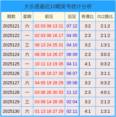 后区分析:最近10期后区号码奇偶比为8:12,其中偶数开出较多,最近10期后区号码012路比为4:7:9,其中2路开出较多。本期关注1路0路号码出号,预测10、12。