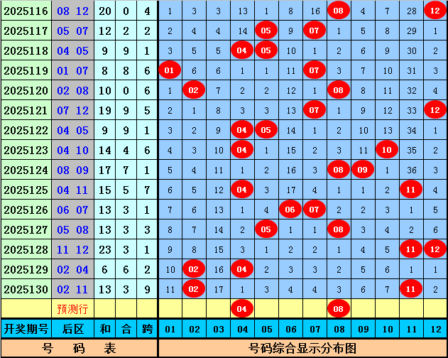 后区分析:上期该位开出奖号02和11,和值为13,跨度为9,后区前4次开出和值13和跨度9时,其下期奖号分别为:07+09、01+06、03+10、02+05,号码奇偶比为5:3,大小比为3:5,012路比为3:3:2,本期后区号码参考01、04、06、08、12,精选两码04、08。
